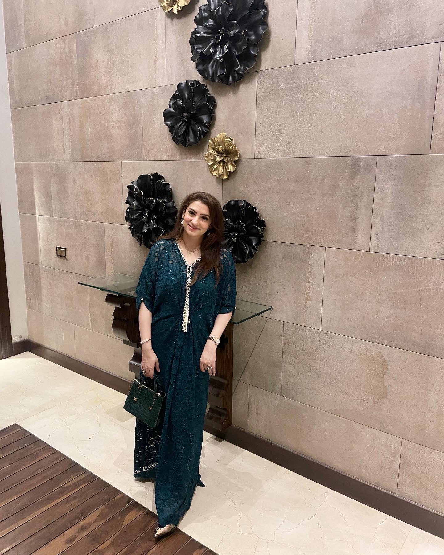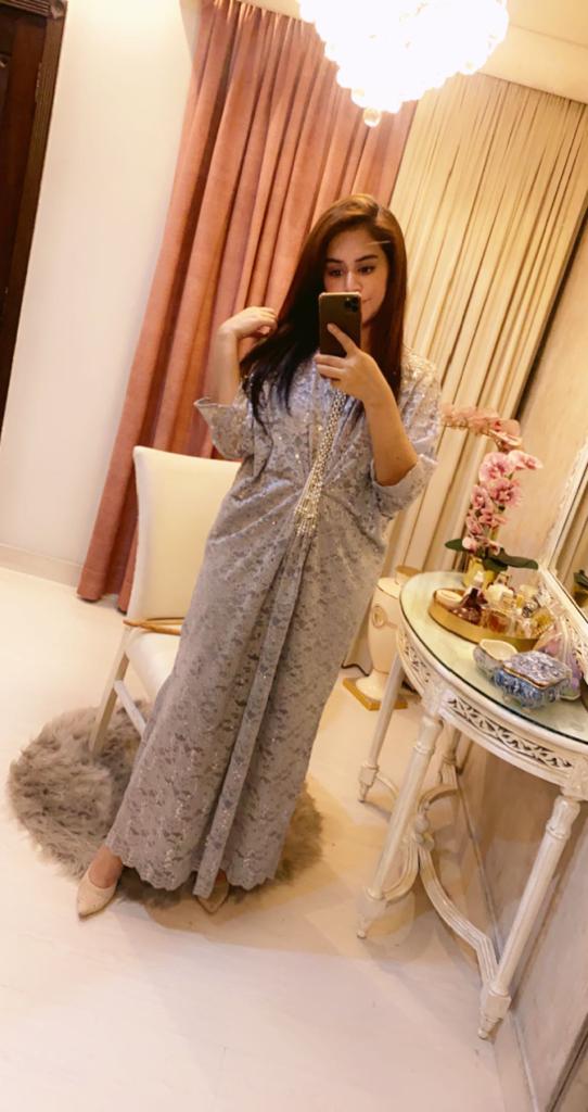 Chantelle lace kaftan is embellished with sequence and subtle pearls Detail on the neck.