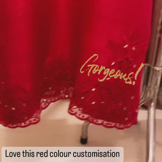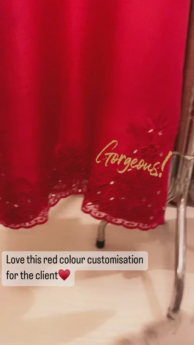 Pure organza dupatta is 4 sided scalloped with cutwork flowers on corners.