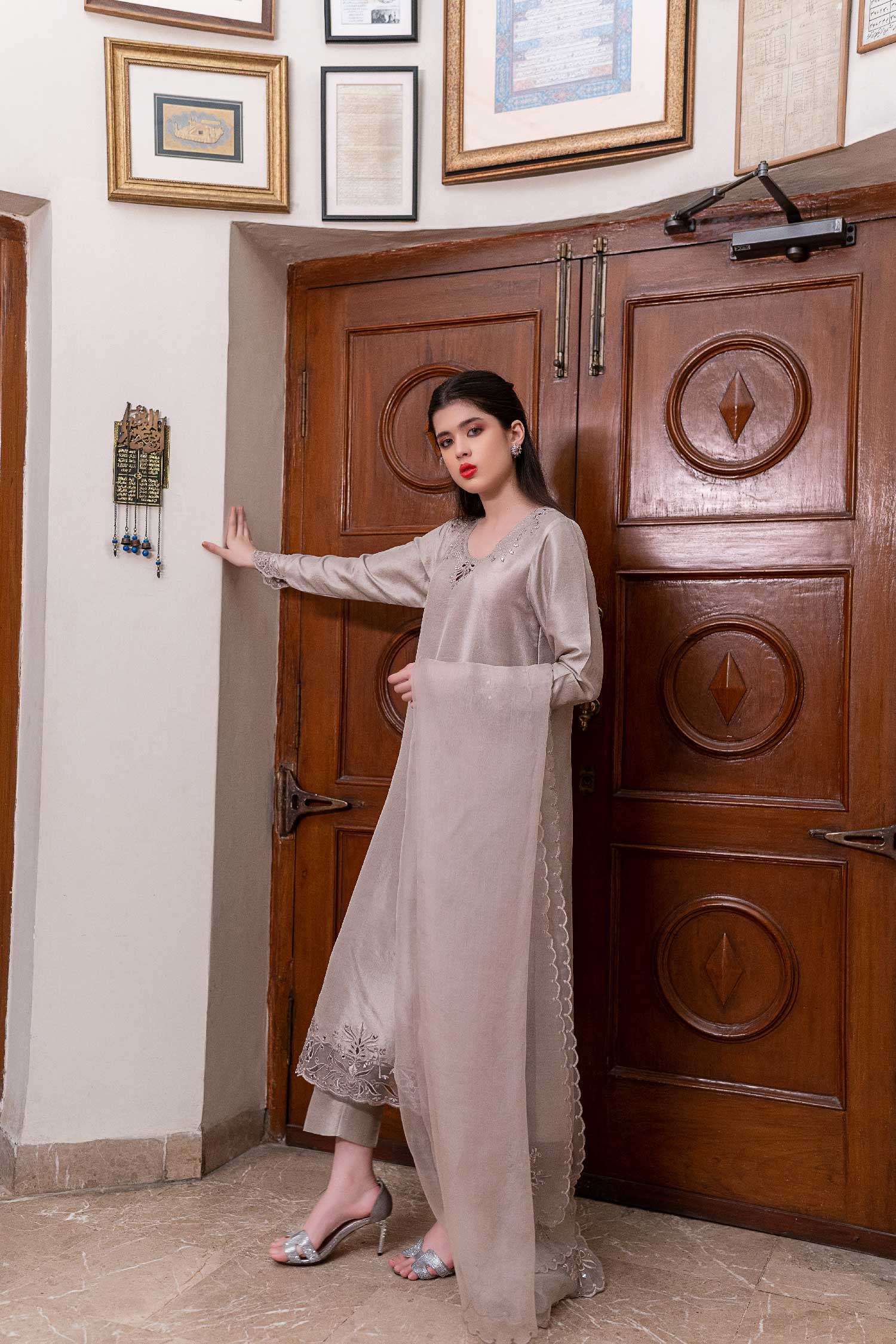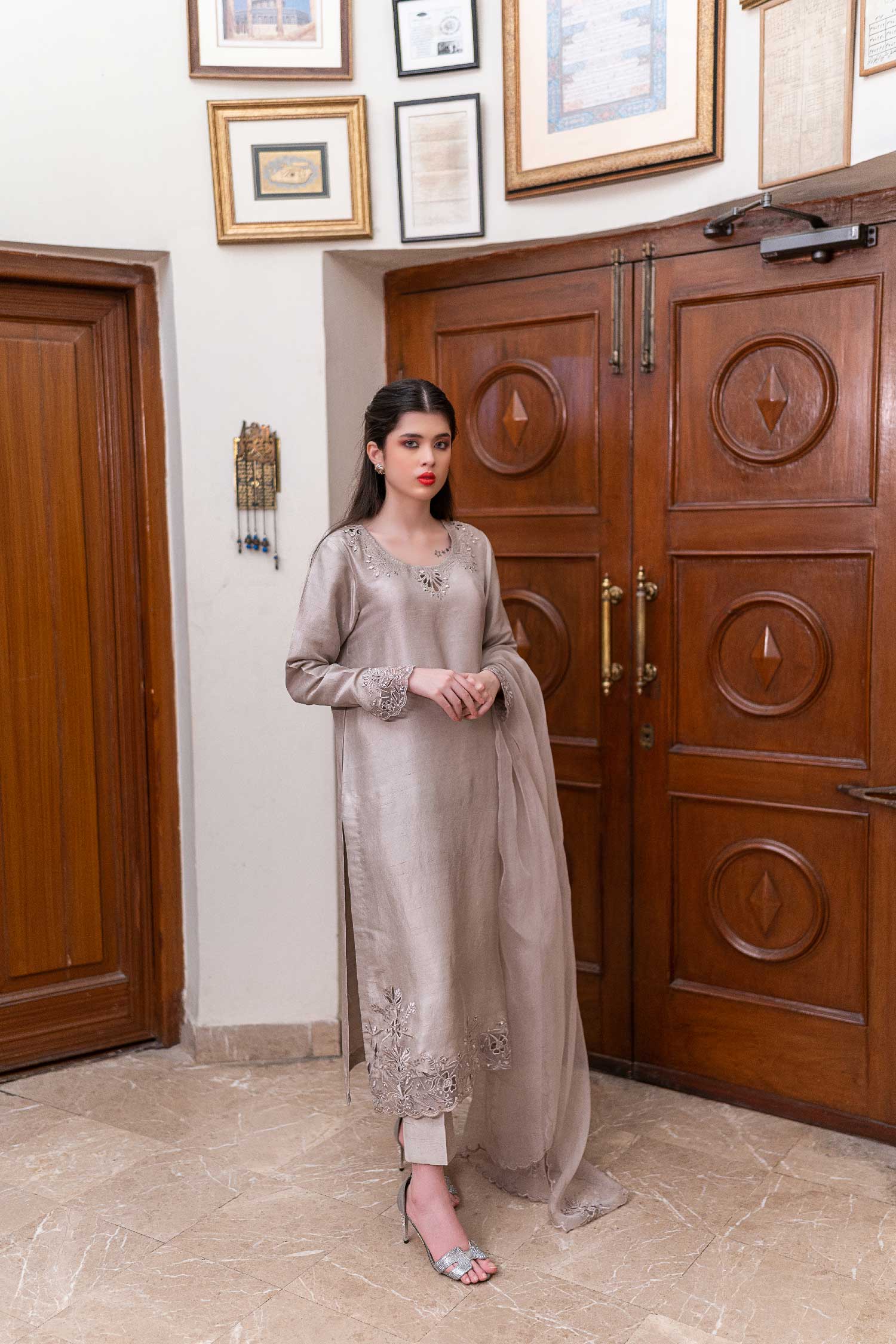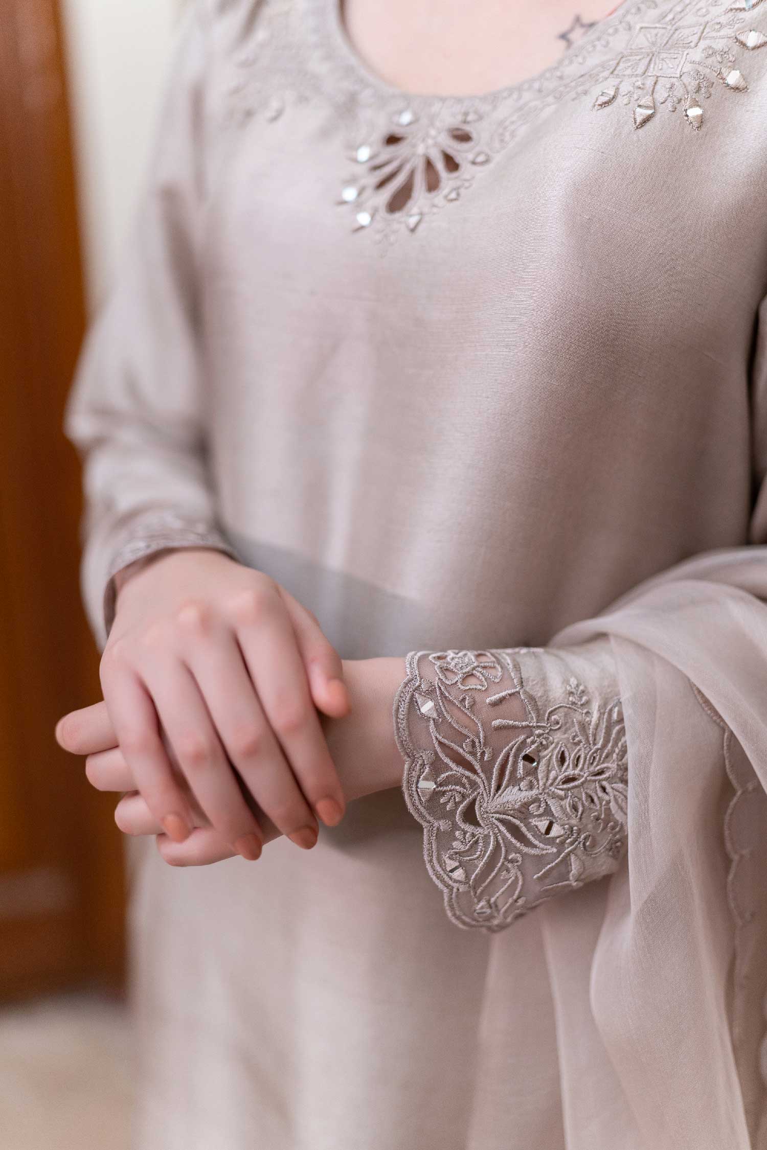 - Our Korean rawsilk grey ensemble consist of beautiful Resham cutwork Embroidery with sheesha on neck, sleeves and hem.