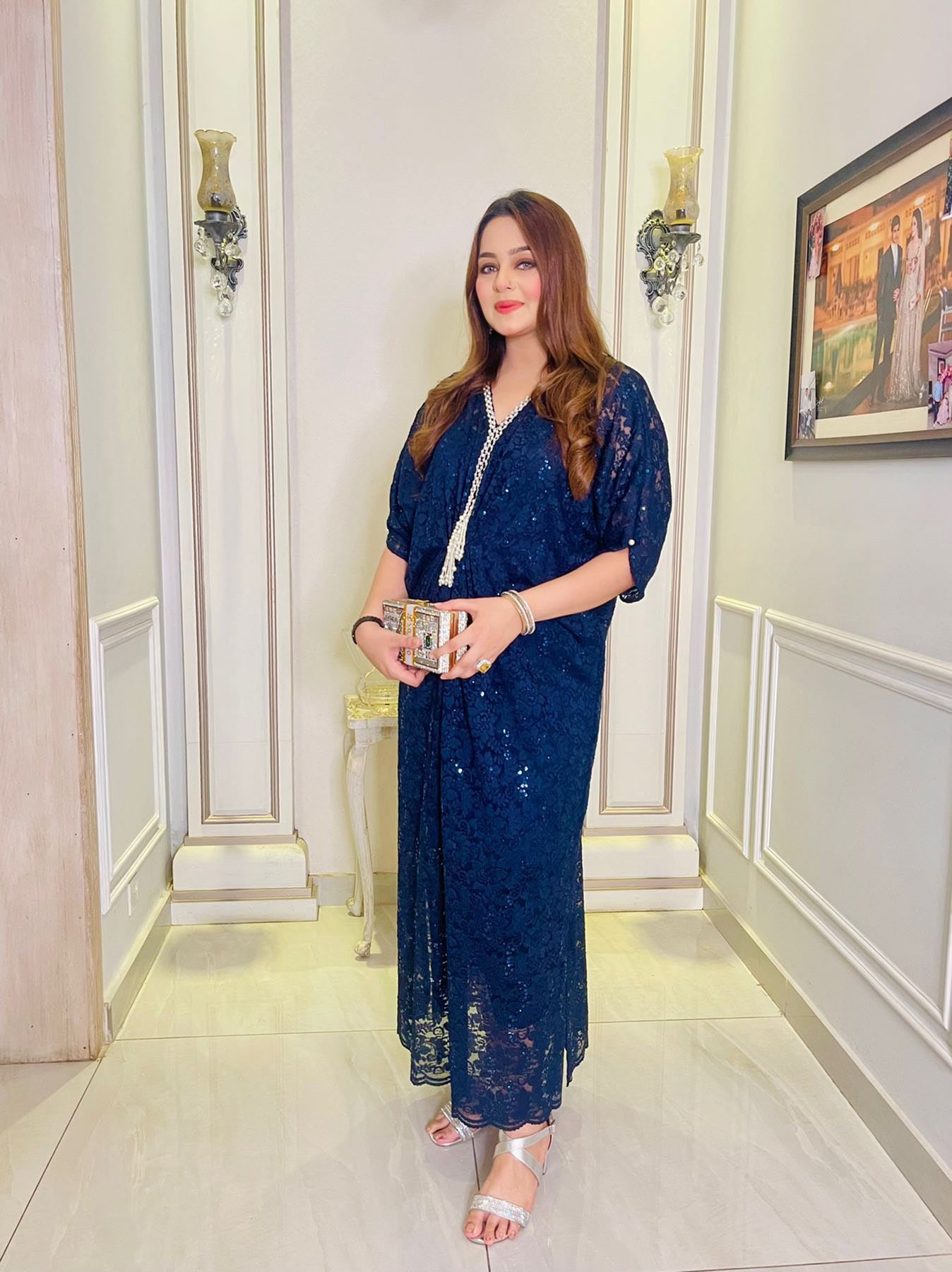 Navy blue Chantelle lace kaftan is Embelished with sequence and subtly detailed pearls tussel on the neck.